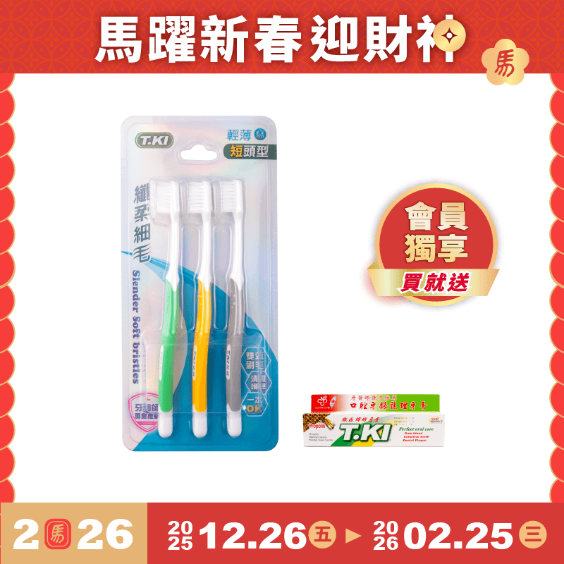 【T.KI】短頭型纖柔細毛牙刷3入組 【買就送】T.KI蜂膠牙膏20gX1支