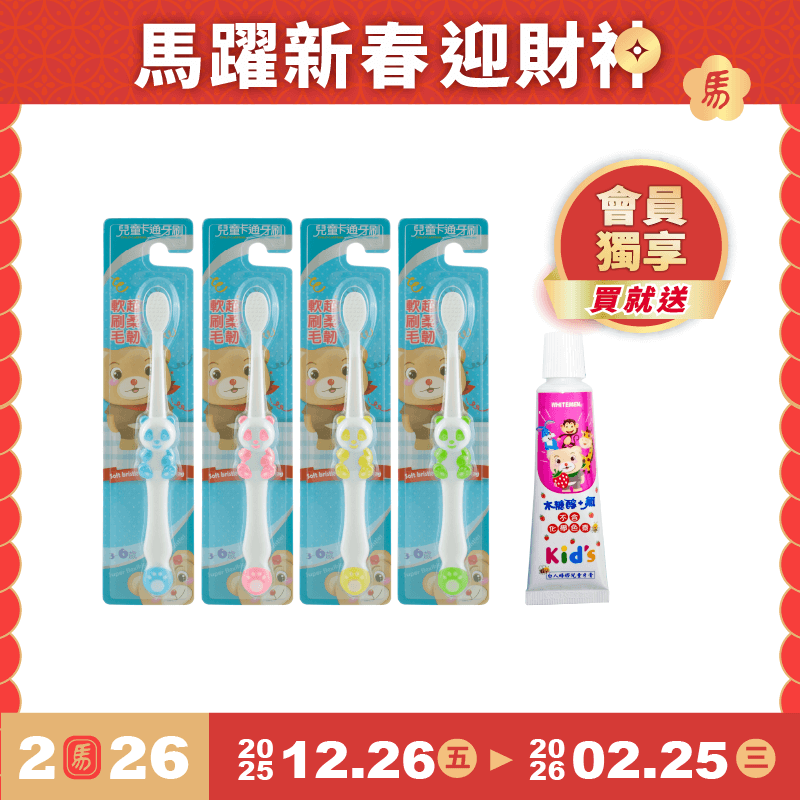 【白人】兒童卡通牙刷-熊貓(4入組) 【買就送】白人兒童牙膏(草莓)30gX1支