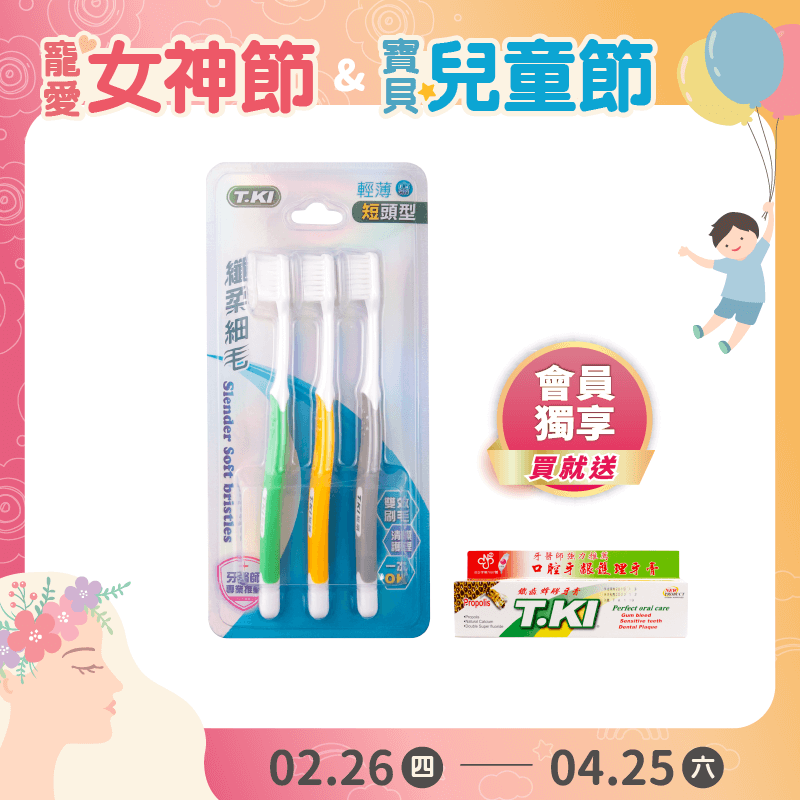 【T.KI】短頭型纖柔細毛牙刷3入組 【買就送】T.KI蜂膠牙膏20gX1支