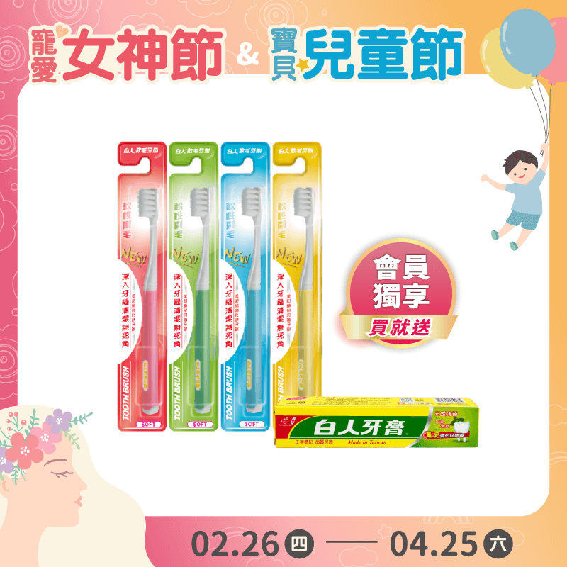 【白人】軟毛牙刷(4入組) 【買就送】白人雙氟雙鈣牙膏40gX1支